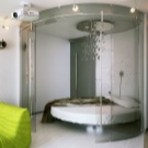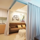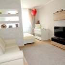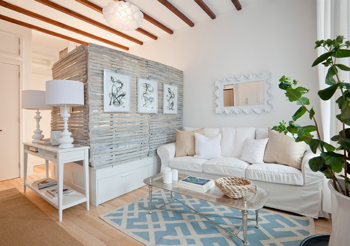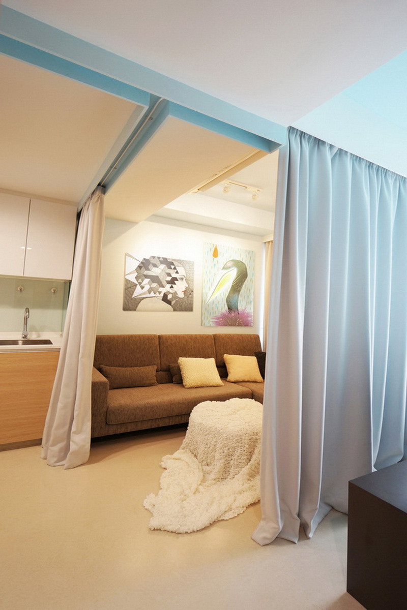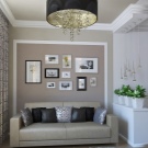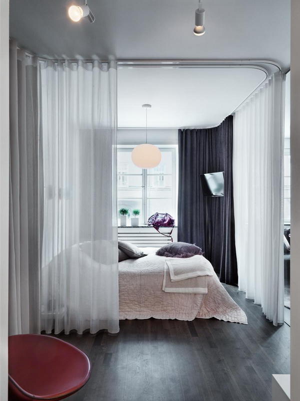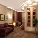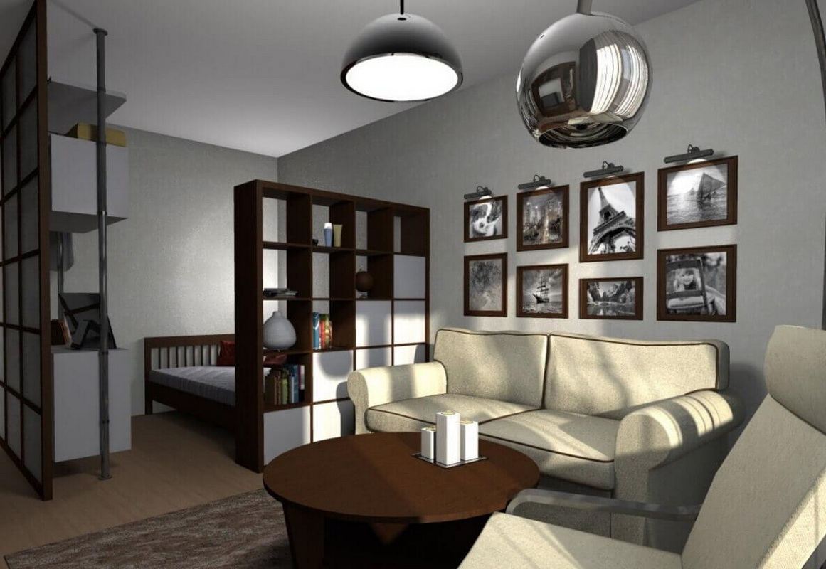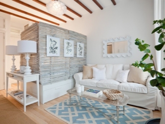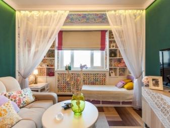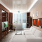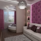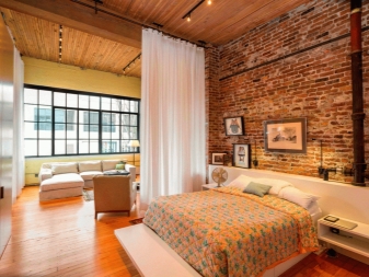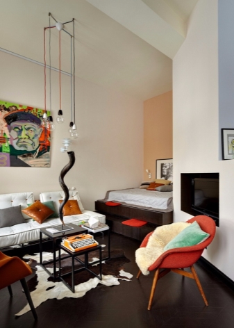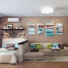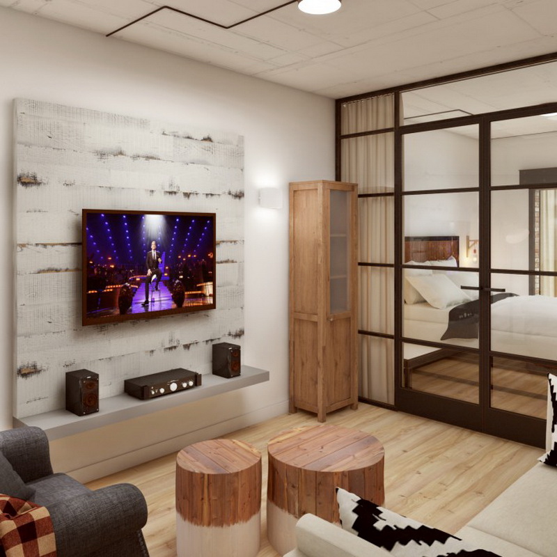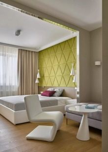 Les concepteurs conseillent donc de maximiser l’utilisation de l’espace pour placer un lit loin de la porte d’entrée du salon. Un coin éloigné avec une couchette, situé sur un petit podium, couvert de rideaux esthétiques, agissant comme un écran ou séparé par une petite cloison en placoplâtre deviendra un lieu isolé dans l'appartement, non encombré de murs inutiles. L'espace principal doit être consacré au salon avec un beau canapé spacieux, une table basse et une télévision, qui, dans certains modes de réalisation, est fixée directement sur la cloison créée avec un espace de couchage.