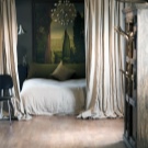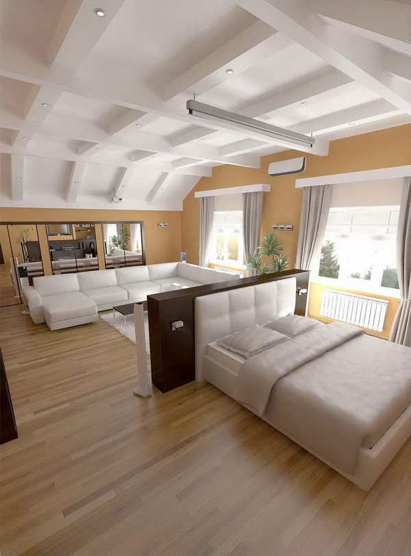 En règle générale, les chambres à coucher combinées au salon sont de petite taille. Il est donc déconseillé de "manger" leur espace dans des tons sombres. La palette de couleurs claires qui règne à la fois dans la chambre et dans le salon permet d’écarter les murs, rendant la pièce plus confortable.