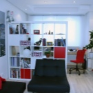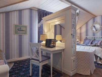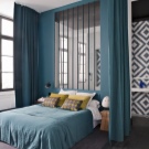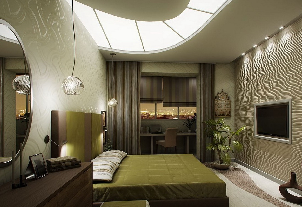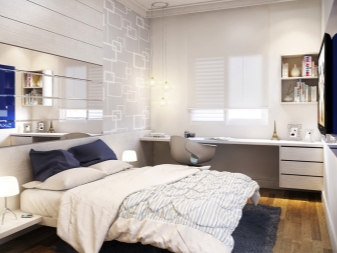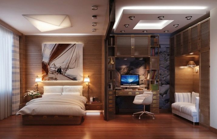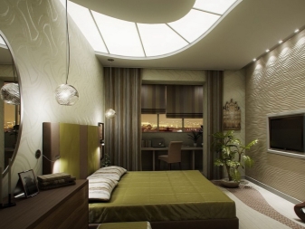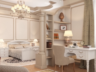 En outre, une bonne option serait l'emplacement d'un rack multifonctionnel avec une documentation utile pour le travail. Sur le côté du lit, le support peut également être rempli de livres, mais déjà artistique et agréable à lire avant d'aller se coucher.S'il n'y a pas de place pour de telles structures, elles peuvent être remplacées par une fine cloison en placoplâtre de forme complexe, par exemple en forme de vague. Le zonage avec la couleur du papier peint et du sol sera également le bienvenu ici.