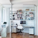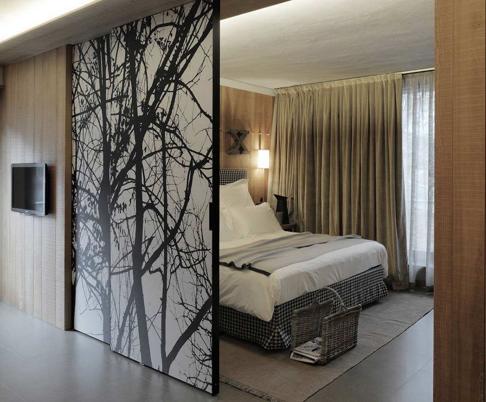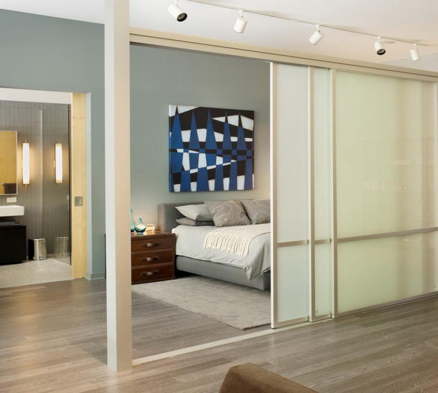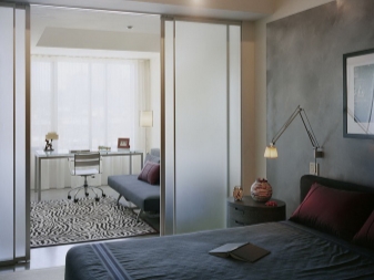 Dans une telle pièce ne pas interférer avec le zonage de haute qualité. Ainsi, même un petit bureau peut avoir des portes coulissantes en verre au design mat. Vous ne pouvez les fermer que de moitié, pour ne pas masquer la zone, mais même dans ce cas, la division en zones sera dégagée.