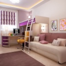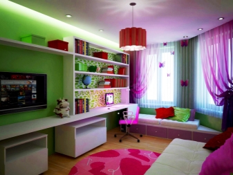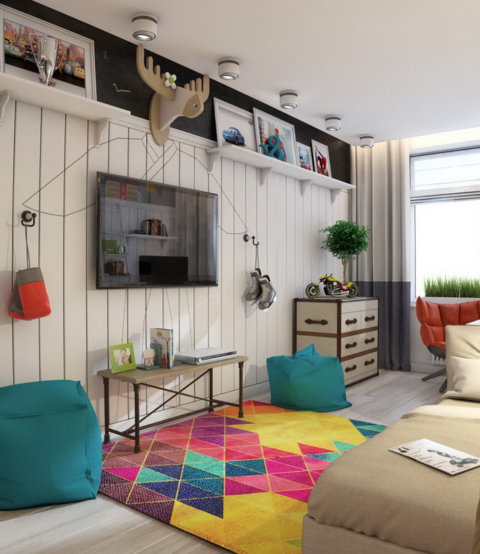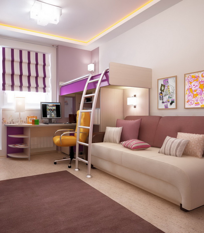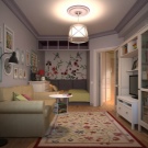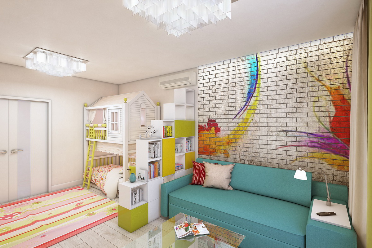 En attendant, l’enfant n’est pas habitué à résoudre des problèmes et à se préparer pour les leçons, vous pouvez lui fournir un endroit esthétique et amusant pour les jeux et le sommeil de jour. Pour ce faire, il est conseillé aux concepteurs de diviser la cloison ou le rack de la salle. D'un côté, il y aura un lit de camp, de l'autre, un canapé et une télévision. Il convient de noter immédiatement que le salon, associé à l'enfant d'une manière ou d'une autre, aura des couleurs un peu plus saturées et lumineuses que le salon de toute autre pièce. Des coussins lumineux sur le canapé, associés à des meubles pour enfants et à de jolies statuettes représentant des animaux, tout cela contribuera à unifier les zones réservée aux adultes et aux enfants.