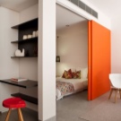 Le podium de la zone de couchage et la cloison incurvée et raffinée de l’intérieur en lilas rose confèrent une grande compétence au concepteur, prouvant qu’un petit espace peut s’agrandir entre les mains et l’esprit des experts dans leur domaine.