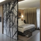 Un lit peut facilement se cacher derrière une armoire intégrée, qui «n'est pas conforme aux règles», située au centre de la pièce et qui est bordée par une cloison. S'il n'est pas possible d'équiper une pièce de cette manière pour quelque raison que ce soit, vous pouvez envisager de transformer les lits. Oui, il s'agit de ceux qui se sont décomposés comme par magie depuis les portes ouvertes du cabinet. Et certains des lits se cachent sous un haut podium et sortent exclusivement pour la nuit. Le podium lui-même pendant la journée joue le rôle d’un salon magnifiquement zoné.