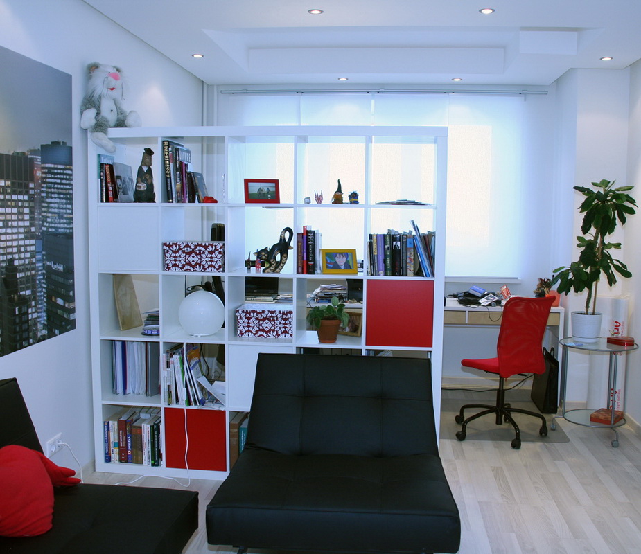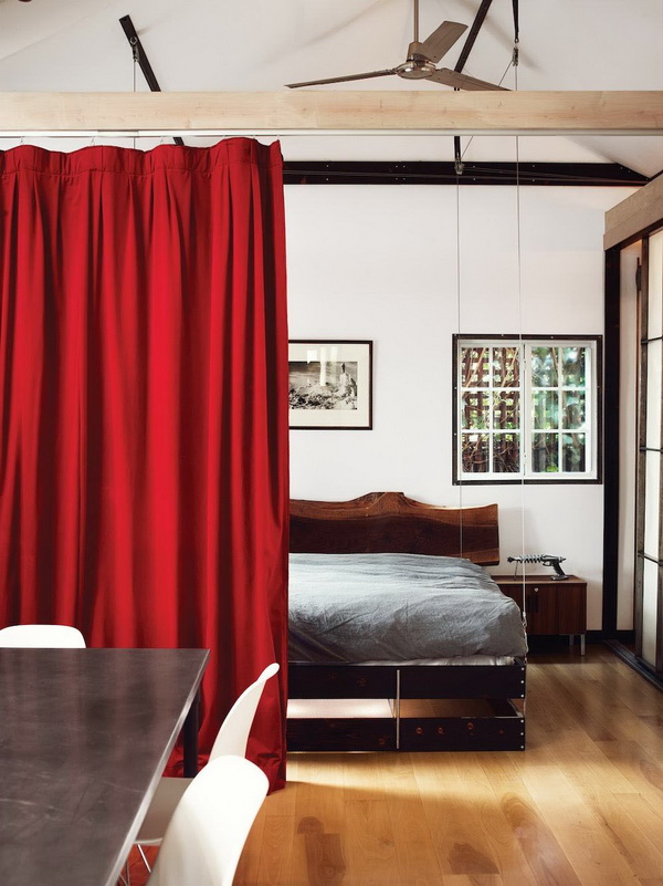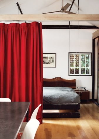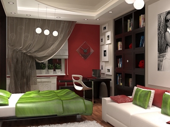 Sur la meilleure façon de séparer les zones de la chambre à coucher et le salon les uns des autres peut mieux montrer de vraies photos de l'intérieur. Ces options peuvent facilement constituer la base de votre décor unique. Intérieur high-tech avec un accent rouge vif sous la forme deUne moquette longue et des oreillers sur le canapé permettent de loger le lit entouré d'un épais rideau gris. Un séparateur supplémentaire est un rack de partition noir connecté à la tablette d'angle.