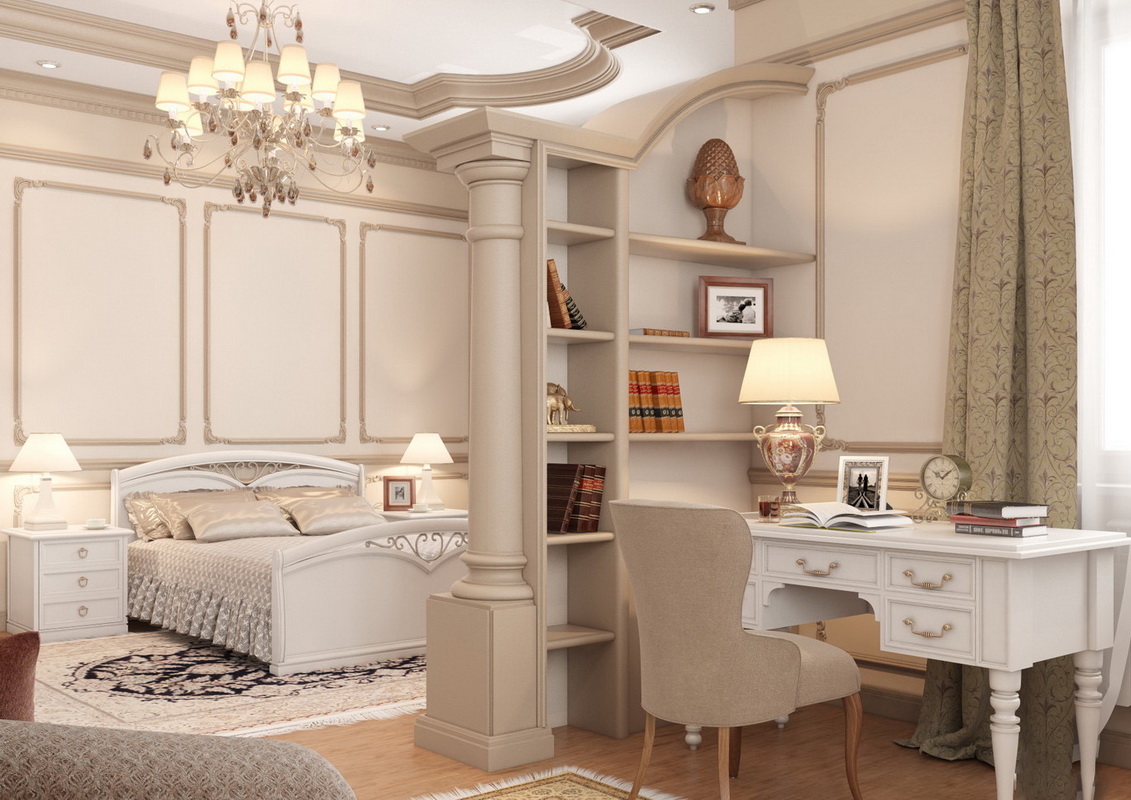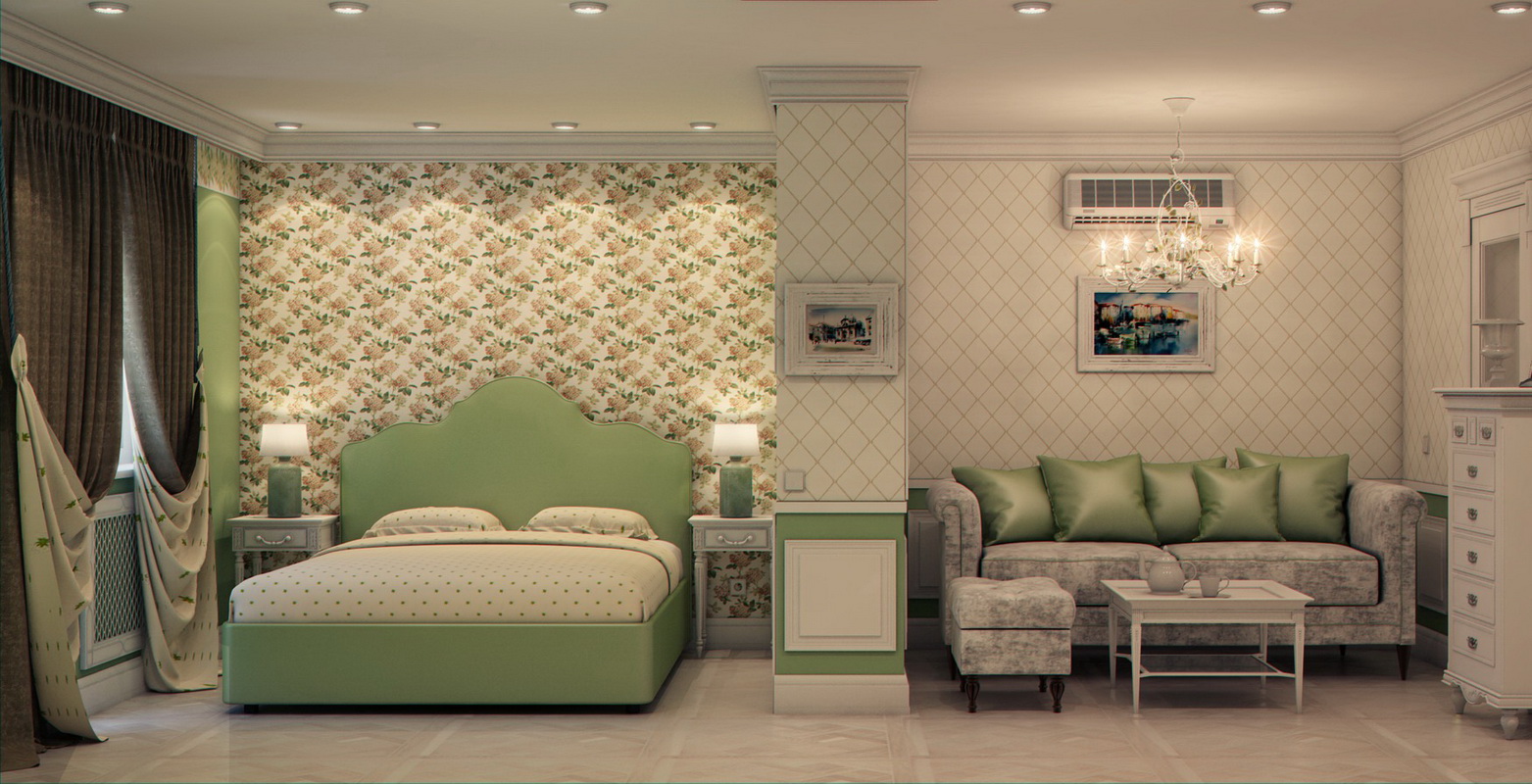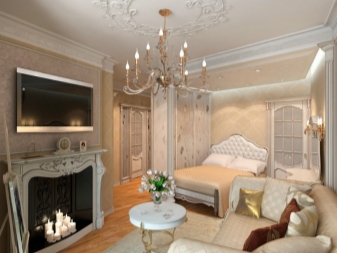 Il n’est pas conseillé aux concepteurs d’utiliser un style excessivement détaillé pour les petites pièces, mais dans un style classique, les salons-chambres à coucher ont un air solennel.Pour concrétiser l’idée de combiner le luxe à un petit espace, il ne faut que quelques détails de l’intérieur classique. Par exemple, il peut s'agir d'un lustre qui n'enlève pas d'espace libre ou d'un papier peint avec des monogrammes et des rideaux de tissus nobles et denses.
