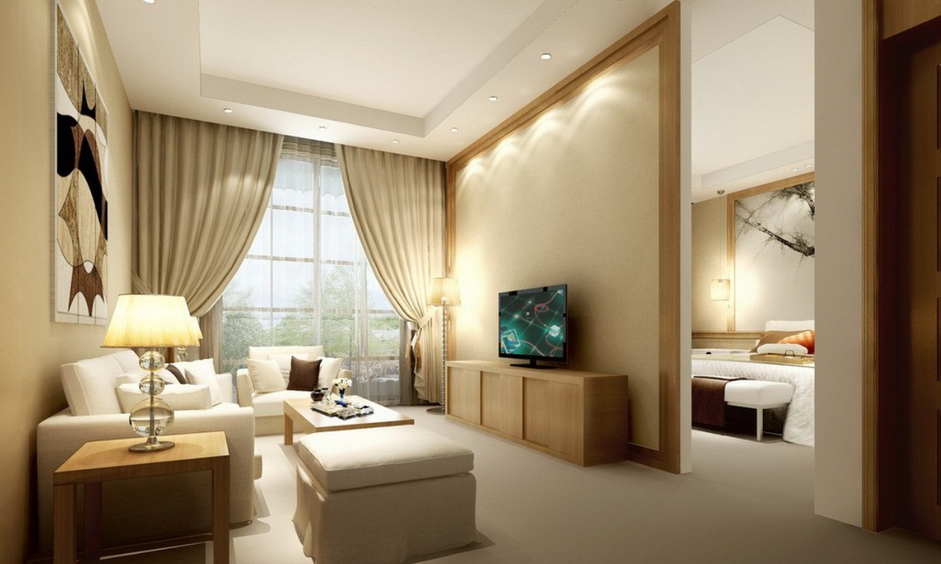 Donc, il est préférable de commencer une combinaison de couleurs du salon. En choisissant une teinte claire ou neutre, telle que beige, sable, gris ou gris-bleu, elle est annulée dans la chambre à coucher ou dérivée de teintes douces. Par exemple, le salon dans des tons de sable, zoné par une petite cloison, est bien combiné à un lieu de couchage, où la place principale est donnée à un ton blanc. La transition inverse du plus profond au moins saturé sera également belle. Ainsi, un salon rose flou avec une chambre aux tons doux de rose cendré deviendra une option gagnant-gagnant.