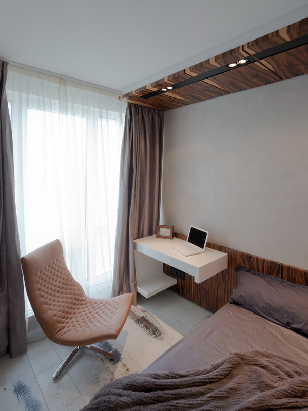 Et si le salon a des caractéristiques communes avec une chambre, il semblerait qu’une chambre en tandem avec un bureau soit quelque chose d’impossible et de complètement différent. En fait, les psychologues et les maîtres de la décoration insistent sur le fait qu'une étude située dans la chambre à coucher est une très bonne solution. Cette zone est remplie de silence, ce qui signifie qu’il est beaucoup plus facile de s'y concentrer que, par exemple, dans un salon bruyant.C'est pourquoi les journées de travail à la maison sont souvent courtes, il est donc important de réfléchir à la conception d'une telle pièce.