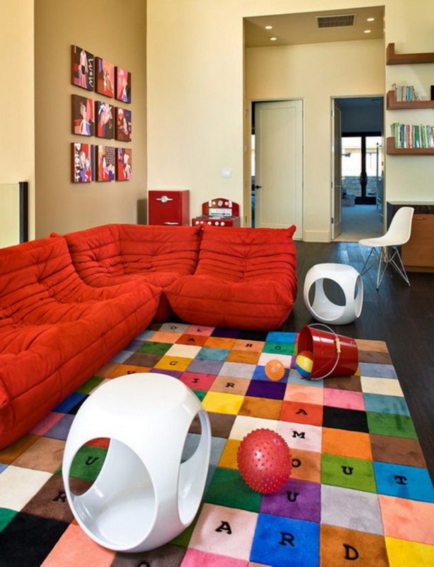 Avec le fait que le salon est un endroit bruyant et absolument pas intime, personne ne peut discuter. Telle est la pièce de l’enfant dans laquelle il passe du temps à jouer activement. Alors pourquoi ne pas les combiner? Les concepteurs conseillent d'utiliser cette idée pour les enfants de moins de 7 ans, car plus tard l'enfant devra organiser son espace personnel et un espace de travail, ce qui est pratiquement impossible à faire dans le salon.