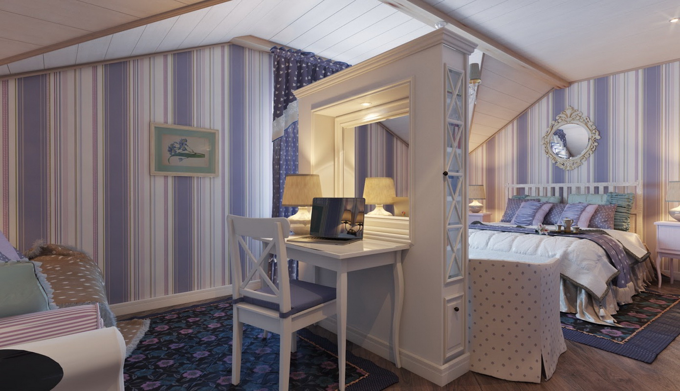 Chambre à coucher dans le style La provence - C’est un territoire de tendresse, inspiré par la simplicité, la précision et le raffinement des villages français. Pour sa mise en œuvre, vous aurez peut-être besoin de meubles avec une tapisserie florale, un papier peint uni ou floral, une abondance de bois, des couleurs vert clair, des tons crème et rose blanchâtre.