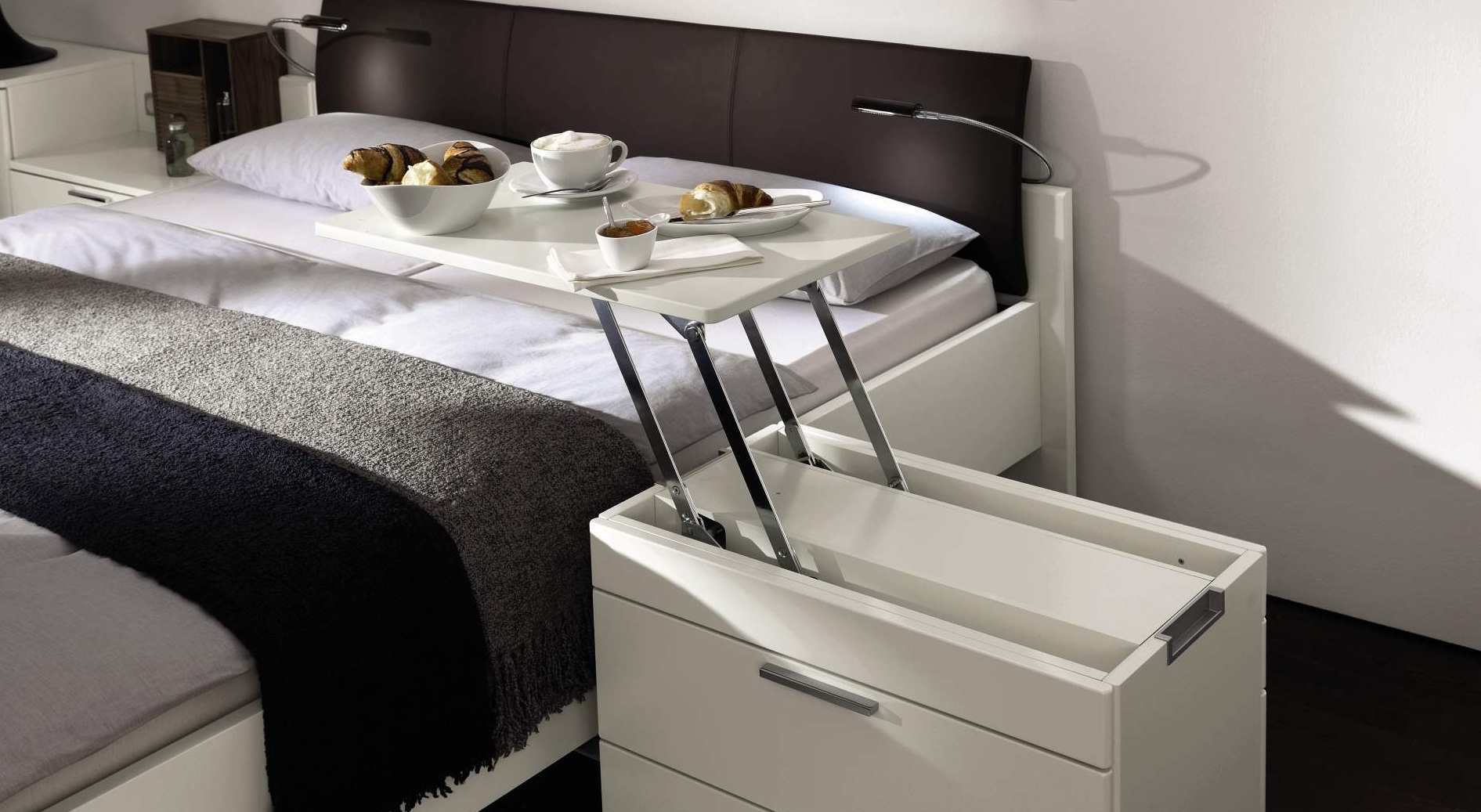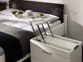 Ces modèles ont des caractéristiques fonctionnelles élevées. Ils peuvent transformer et prendre la forme, par exemple, d'une table. Ainsi, à tout moment, vous pouvez organiser vous-même une étude ou un lieu où vous pourrez boire une tasse de thé parfumé et discuter avec des amis. Vous pouvez mettre un tel modèle en tête de lit. Ils peuvent être étroits ou grands, avec des jambes ou une plateforme.
