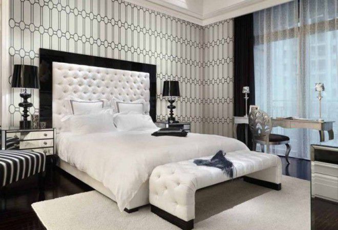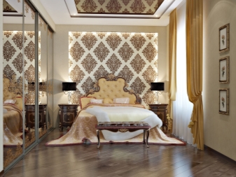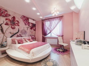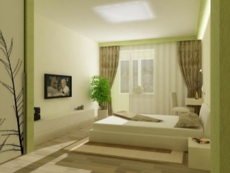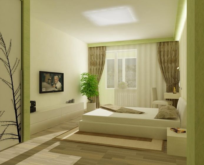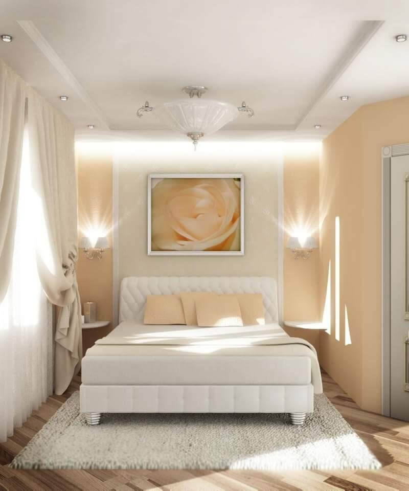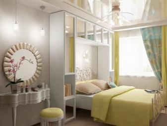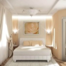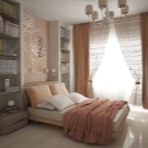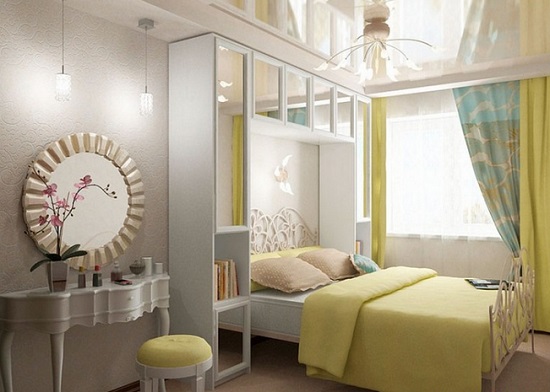 Le lit n'a pas besoin d'être placé le long des longs murs.On aura donc l'impression que même un lit dans cette chambre était bourré de difficultés. Au contraire - si vous le mettez à travers la pièce, il y aura plus "d'air". Dans ce cas, la garde-robe doit être faite dans une niche, de préférence avec des compartiments à portes coulissantes. Idéalement, il sera monté sur un petit mur, dans la partie la plus sombre de la pièce.
