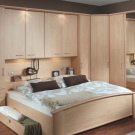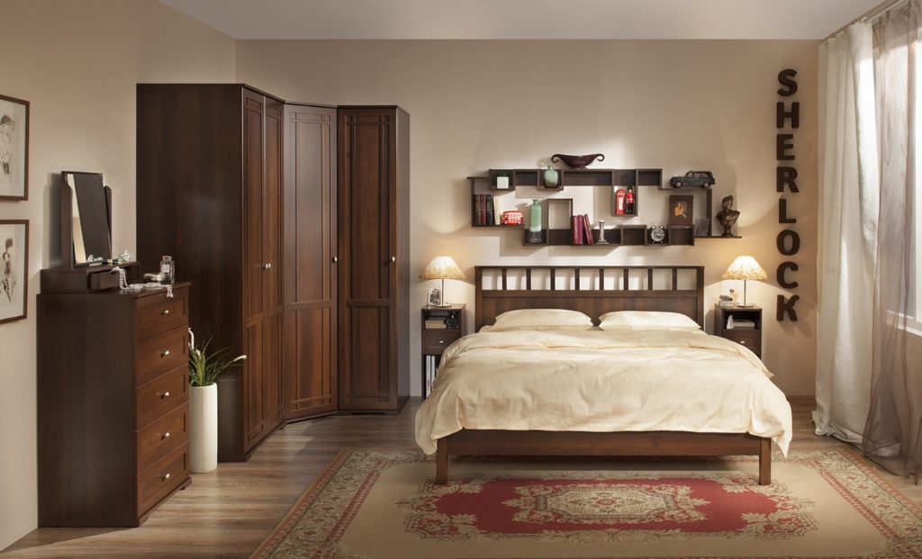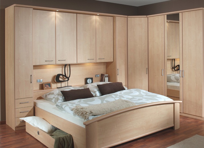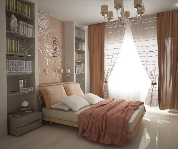 Si le lit - deux personnes, il est nécessaire que la place était des deux côtés. Dans ce scénario, dans une petite chambre, il n'y a pas de place pour des tables de chevet. Ils sont très nécessaires - un réveil est réglé, ainsi qu'un tube de crème, des livres ou des magazines, un téléphone portable. Dans ce cas, sauvé étagère sur le mur - non loin de la tête. Vous pouvez faire des étagères des deux côtés - ce sera original et fonctionnel.