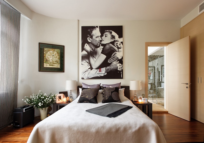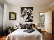 Sur le mur opposé à la tête de lit, vous devez suspendre quelque chose qui plaît à l'œil - une photo préférée, une affiche ou une photo de famille.