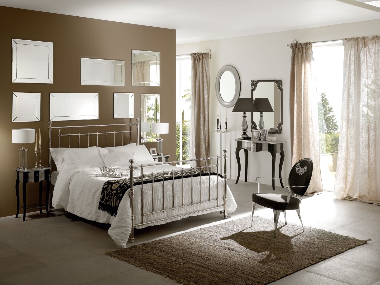 Photographies intéressantes ou peintures avec cadres en bois, lampes originales avec abat-jour en verre ou textile brillant, qui seront installées sur les tables de chevet, éléments de forgeage décoratifs, par exemple, il peut s’agir de supports spéciaux pour la fixation de lampes, d’un très beau lustre.