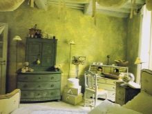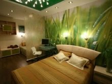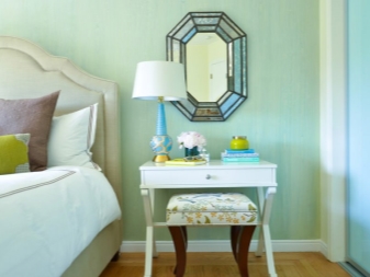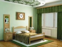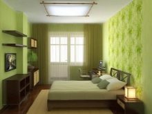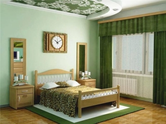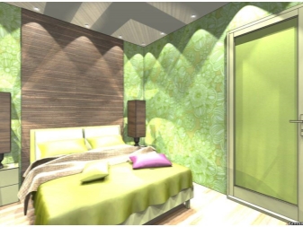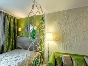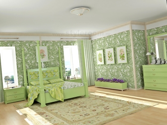 Lorsque cette couleur est utilisée à l'intérieur, elle ne sert pas uniquement à décorer des murs. En plus du papier peint vert, vous trouverez dans la chambre à coucher des meubles, des matériaux textiles et des objets de décoration, également fabriqués dans des tons verts qui diffèrent de la couleur des murs.
