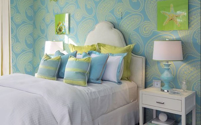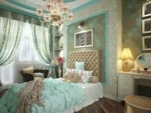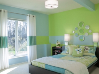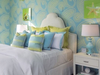 Les couleurs vertes et bleues vont bien ensemble. Cette combinaison est bénéfique pour la chambre à coucher. Il ajoute une atmosphère de légèreté, de fraîcheur et de fraîcheur. Ce duo est populaire pour la décoration des chambres dans le style marin. L'une des couleurs peut être brillante, l'autre douce et pâle. Pour les connaisseurs de dessins lumineux, les deux couleurs peuvent être riches.