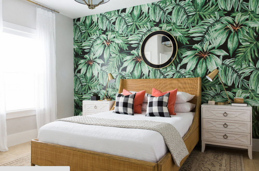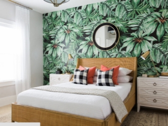 Le style tropical est choisi par les gens qui, pendant la saison des vacances, vont dans des régions chaudes et veulent garder ce sentiment toute l'année. Ce style se caractérise par des nuances de vert vives et riches, qui s'expriment dans la décoration des murs. Dans notre cas, pour décorer une pièce tropicale, choisissez du papier peint vert, monophonique ou avec un motif thématique. Par exemple, il peut s'agir d'images de grandes feuilles de palmier ou de bambou.