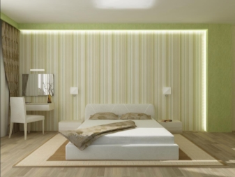 Dans un style moderne, il y a aussi une place pour le vert. La conception de haute technologie et de praticité n’est pas sans fraîcheur. Papier peint dans les tons d'aiguilles ou de mousse - un excellent choix pour les chambres à la pointe de la technologie. Les tons gris-vert seront également combinés avec élégance avec des détails chromés, une technique innovante, des formes strictes et d'autres caractéristiques de ce style.