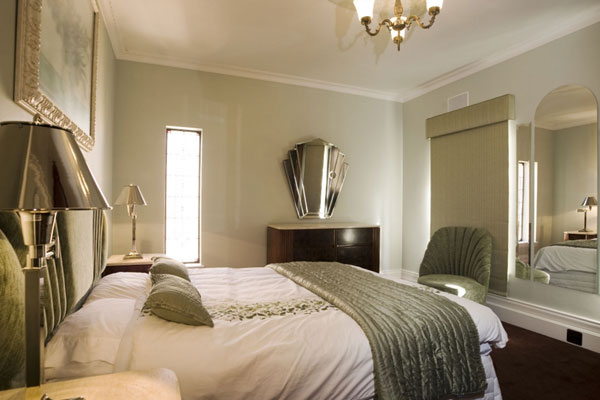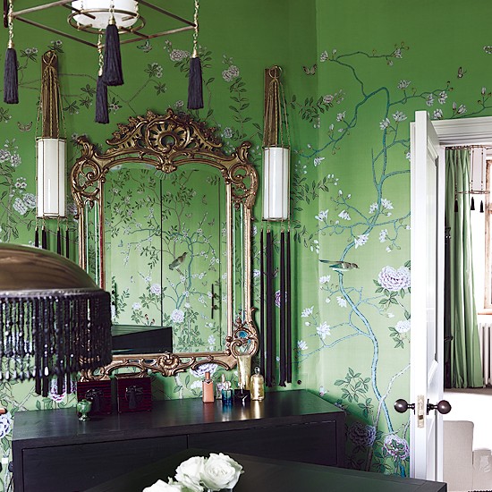 Intérieur raffiné et élégant, choisi par les amateurs de luxe et de chic. Si le style est décoré dans des tons sombres, la couleur verte des murs peut embellir la pièce,rendre les couleurs plus expressives. Pour ce style, il est recommandé de choisir une nuance de jeunes aiguilles ou de pomme verte.