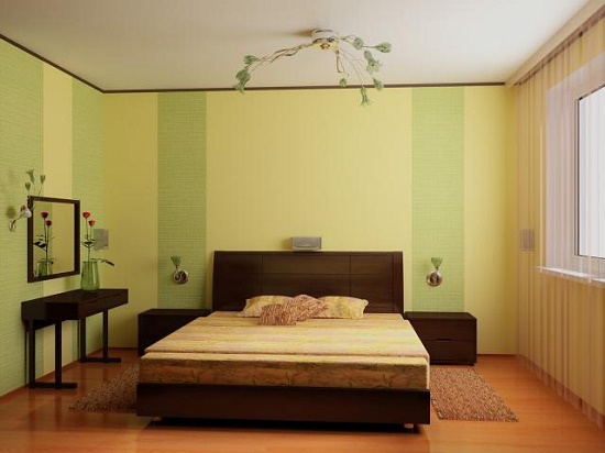 Afin de donner l'atmosphère de rayonnement, le jaune est parfait. Cette couleur en combinaison avec des tons verts est associée à l'été, aux fleurs, à la saison chaude. Rappelez-vous que la couleur jaune excite la création, elle ne doit donc pas être trop souvent dans la chambre à coucher, sinon cela ne fonctionnera pas dans une telle pièce.