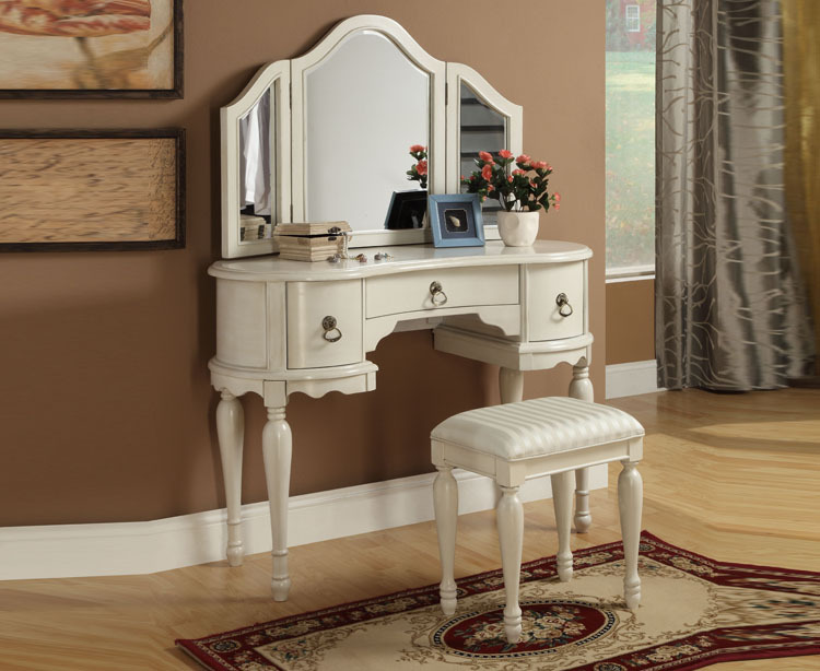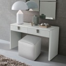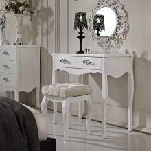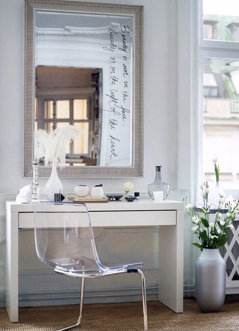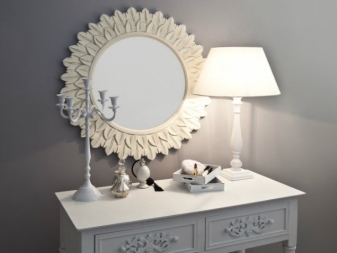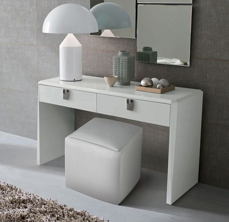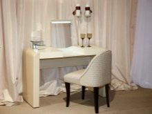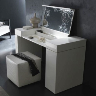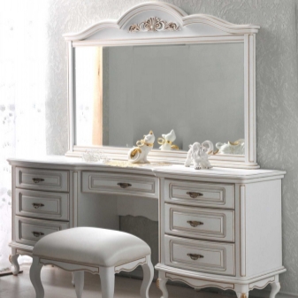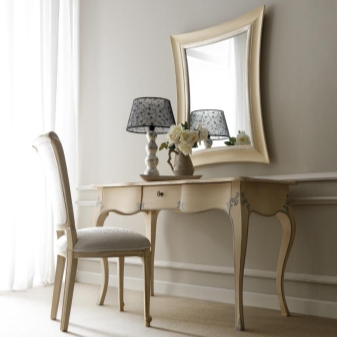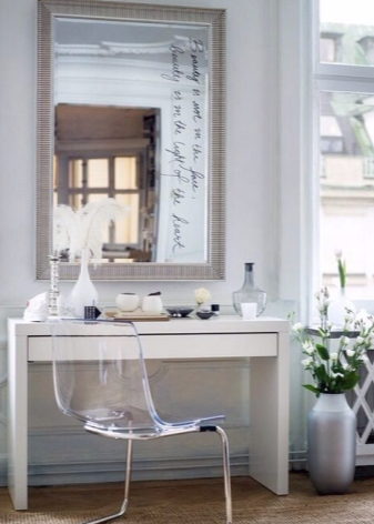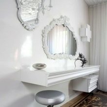 Les modèles peuvent avoir un miroir ou être sans.Bien sûr, une coiffeuse blanche avec un miroir est beaucoup plus pratique. Inutile de chercher un attribut approprié, accrochez-le au mur. Mettez une table - et vous pouvez le faire vous-même. Ce type de mobilier est assez commun. Il est fabriqué sous la forme d’une pile de verre ou de treillis.