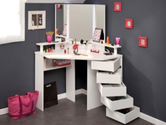 Le premier type occupe une surface plus petite, il peut donc être installé même dans une petite chambre. En raison des caractéristiques de conception, leurs boîtes sont assez grandes et peuvent facilement accueillir tout ce dont vous avez besoin - des crèmes au rouge à lèvres.
