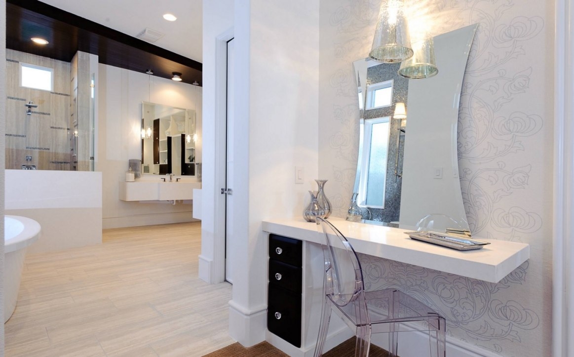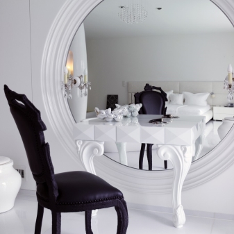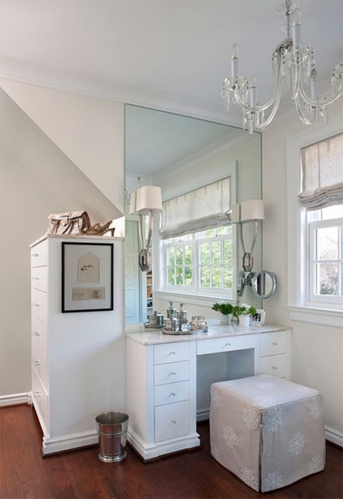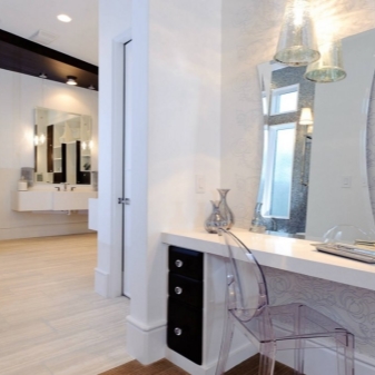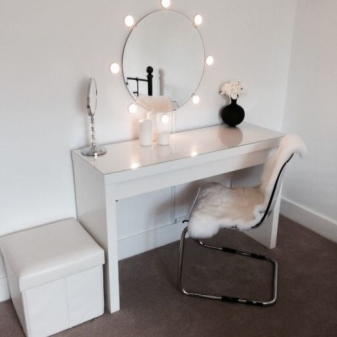 - Style de chambre. La coiffeuse blanche devrait parfaitement s’adapter à la situation et devenir le point fort de l’intérieur de votre chambre à coucher. Il peut être combiné au reste du mobilier non seulement en couleur, mais également en forme. S'il s'agit d'un accent dans la pièce, il doit être soutenu par des textiles blancs ou par plusieurs accessoires de la même couleur.