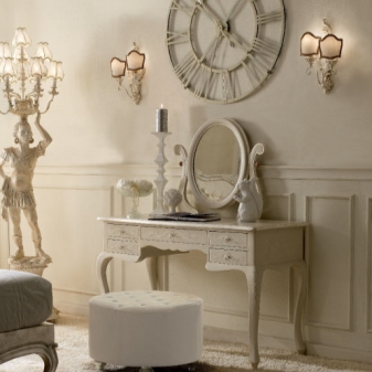 En outre, l’apparence des coiffeuses blanches dépend fortement du style auquel ce produit est destiné. Le classique de la Provence est donc une table de cette solution colorée en bois naturel. Le revêtement ici est de préférence mat. Possible ornement floral en petite quantité sur les portes des portes.