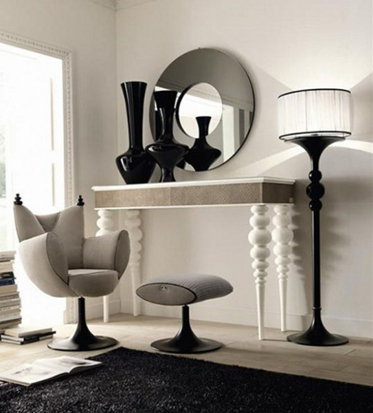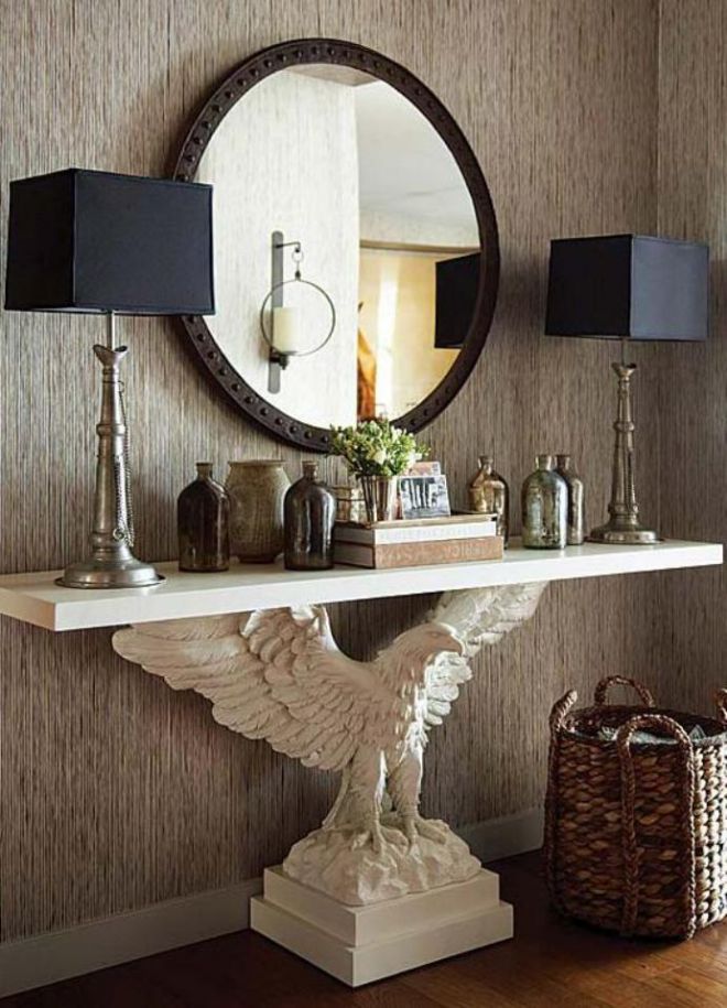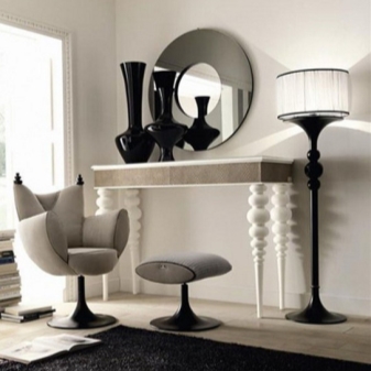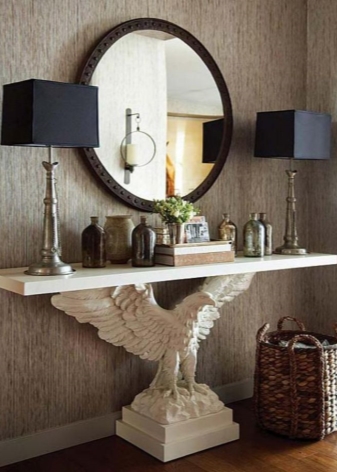 Un grand miroir rond du sol au plafond, décoré d’appliques avec des pendentifs en cristal et d’une petite table aux pieds sculptés constituera une décoration originale de l’intérieur dans le style Art Déco.