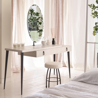Un plateau de table blanc de différentes hauteurs sur de fines jambes noires est un modèle assez léger et visuellement en apesanteur qui s’intègre parfaitement à l’intérieur romantique de la chambre d’une fille. Il ne peut même pas s’approcher du mur et laisser à la place de la pièce la plus éclairée, d’autant plus que le miroir est fixé directement sur le dessus de la table.