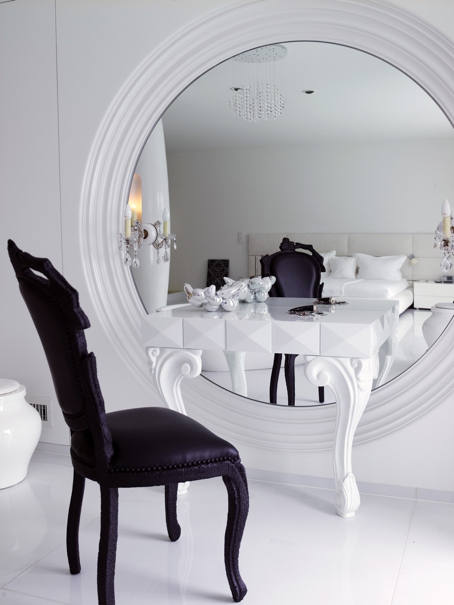 Une coiffeuse blanche est souvent utilisée pour créer l'intérieur original de la chambre à coucher. Voici quelques idées intéressantes, conçues par différents designers pour les intérieurs modernes de chambres à coucher. Une table brillante avec un miroir pliant de formes géométriques simples dans une chambre à coucher en graphite de haute technologie sera non seulement fonctionnelle, mais deviendra également l’accent principal attirant tous les regards.