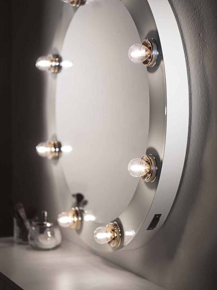 - L'éclairage Si votre chambre à coucher est très sombre, vous devriez faire attention au modèle avec lumière. Mais dans ce cas, au stade de la réparation, vous devez fournir une prise pour connecter la lampe à l'électricité. Rappelez-vous que la lumière doit correctement tomber sur le visage, sinon elle peut déformer les ombres et que leur perception sera complètement différente de celle à l'extérieur sous un éclairage naturel. Vous devriez donc préférer les modèles où les lampes sont situées autour du périmètre du miroir.