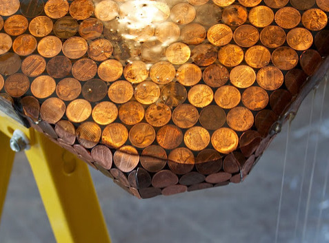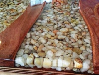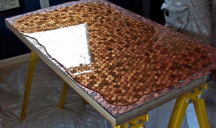 Pour les incrustations, nous choisissons selon vos goûts: de vieilles pièces de monnaie, de petites tuiles pour le «tablier» de la cuisine, ou des copeaux et des morceaux de bois de couleurs et races différentes. Diluer la résine et laisser infuser. Parallèlement, nous posons notre décor sur la surface de la table, puis nous versons doucement la colle préparée.