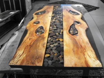 Vous devez d’abord fabriquer un cadre de table en bois ou en métal et la base du plateau. Cela peut être une toile solide pour la coulée, ou des pièces individuelles qui seront posées dans le cadre de la future table, seules les ouvertures et les coins seront coulés. Le résultat dépend de quels blancs utilisez-vous pour les bases. De cette façon, vous pouvez obtenir l’imitation d’un ruisseau, d’une rivière, d’un ravin inondé ou d’un relief fantastique.