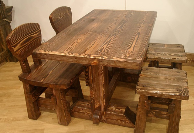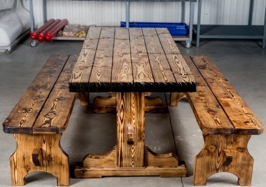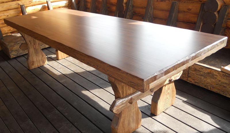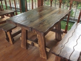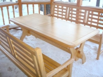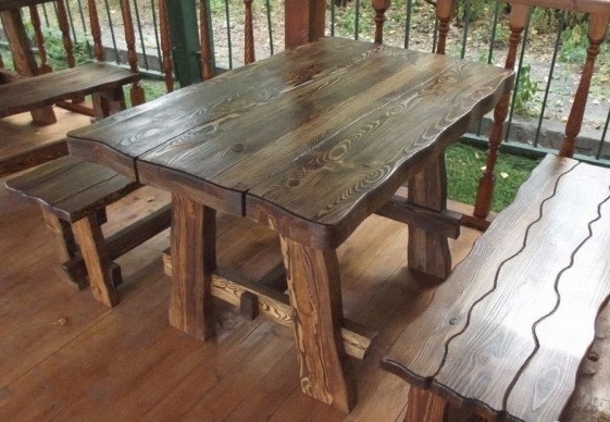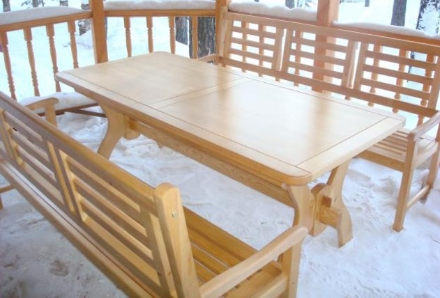 - La table en pin massif convient bien à la terrasse d'une maison de campagne. Si la terrasse est ouverte, le mobilier est imprégné de composés spéciaux pour la résistance à l'humidité et aux effets des insectes. La simplicité de la conception créera un sentiment de proximité avec la nature.