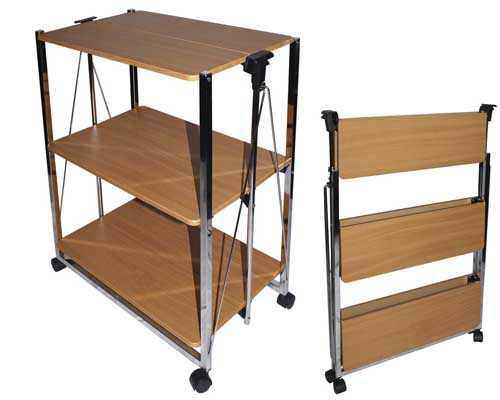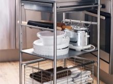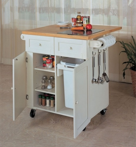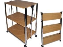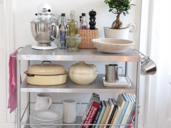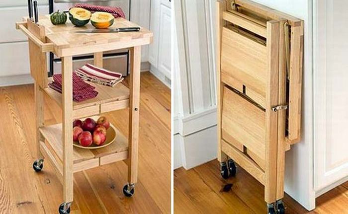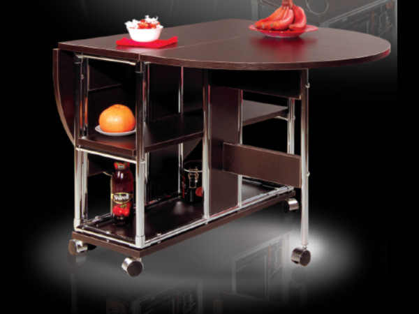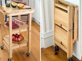 Les transformateurs sont particulièrement populaires. Un tel meuble pliant se cache facilement derrière un canapé, dans le garde-manger, juste placé contre le mur. Les attributs de cuisine sur roues peuvent être retirés immédiatement après la cuisson.