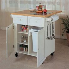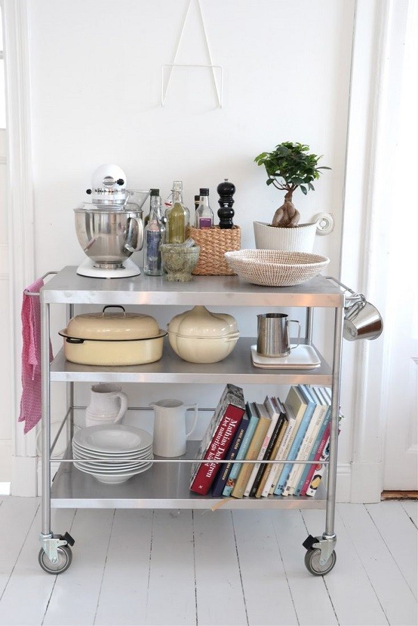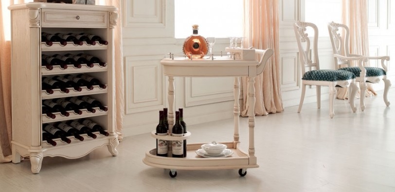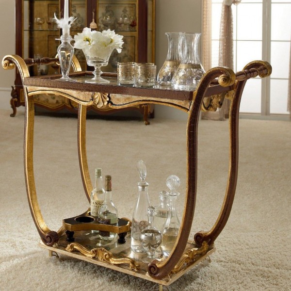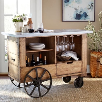 - Chariots de pays. Sur un tel objet sont placés non seulement des plats cuisinés, mais également divers plats, couverts, serviettes de table, etc. Les produits en bois sous la forme d'un chariot ordinaire sont populaires: ils peuvent être créés de manière moderne ou avoir un look rétro.