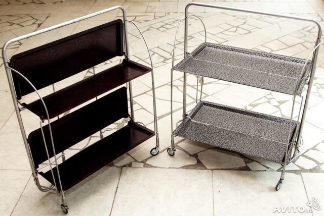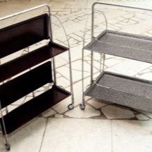 - Matériaux Il est important de déterminer à quelles fins le produit sera utilisé sur des roues, car le matériau utilisé pour sa fabrication en dépendra. Si un tel attribut est nécessaire pour une utilisation fréquente, un modèle en bois serait une excellente option.La surface ternie avec des rayures est facilement repeinte dans la couleur souhaitée, mais avant cela, elle doit être nettoyée avec du papier de verre. Il existe des modèles combinés (métal-bois, bois-verre, etc.) qui doivent être combinés avec succès avec la conception de la pièce.