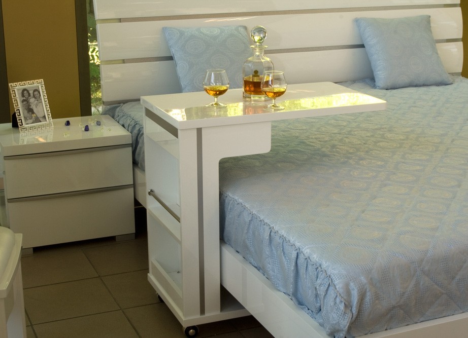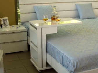 Pour la cuisine, il existe des modèles spéciaux en métal avec des côtés pour empêcher la vaisselle de tomber. Il existe des modèles avec tiroirs et même une poubelle. Mais dans la chambre à coucher, vous pouvez ramasser des tables de chevet sur roues. En apparence, elles ressembleront à une table de chevet, car elles sont souvent équipées d'étagères ou de compartiments dissimulés pour le rangement de certains vêtements.