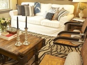 - Direction ethnique. Ces attributs sont un accent brillant dans la pièce en raison de la variété de formes et de matériaux: pierre, rotin, pierre, cuir, etc. La sculpture ou l'ornement sont utilisés comme décor.