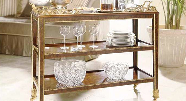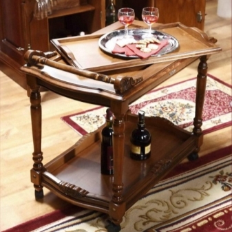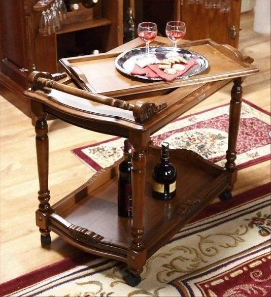 - Attributs de service. Créé pour servir du thé, du café ou des tables de repas ont des plateaux amovibles. Afin de ne pas laisser tomber les plats, les fabricants ont fourni des limiteurs spéciaux. Certains modèles sont multifonctionnels grâce à un dispositif unique où vous pouvez mettre des bouteilles de vin, des verres et autres petits objets.