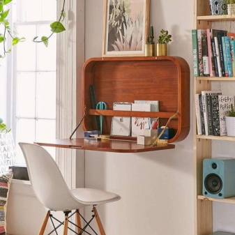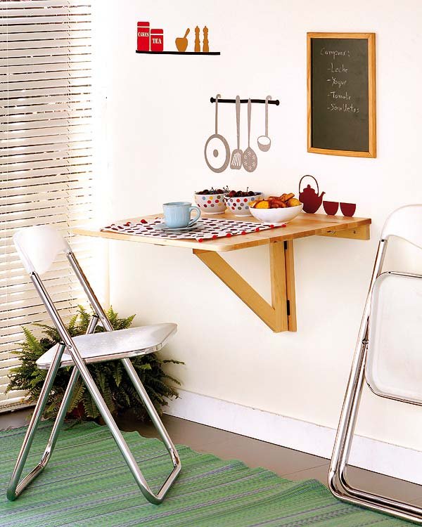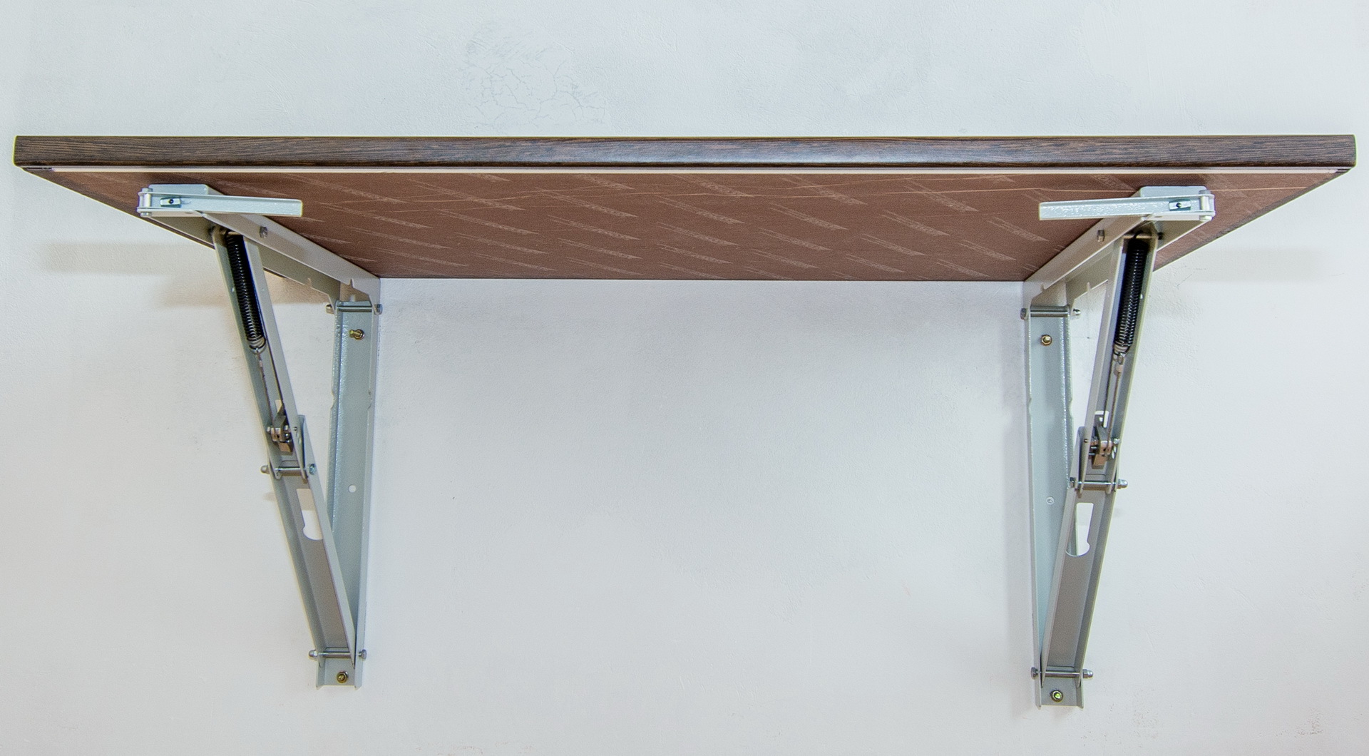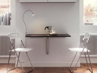 Une caractéristique de cette conception est qu’il est assez facile à installer. La plupart des modèles dans les magasins sont déjà présentés prêts à l'emploi, vous n'aurez même pas le temps de les assembler à partir de composants.Ainsi, vous ne pouvez que rentrer chez vous et installer la table finie sur le mur, en la fixant aux vis et aux charnières. Il sera seulement nécessaire d’ajuster son emplacement sur la surface et de vérifier son apparence et son fonctionnement.