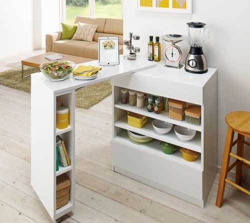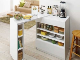 Sa principale différence par rapport à tous les modèles décrits est qu'une partie du plateau se penche en arrière, une partie reste en l'état. C'est-à-dire qu'il est impossible de plier complètement et de plier la table à un état vertical près du mur. Il peut être plié sous la forme d'un petit cabinet. C'est une option très pratique et fonctionnelle qui peut être utilisée pour le stockage permanent de certains articles de cuisine, tels que la vaisselle, les poivrières, les sucriers et autres.