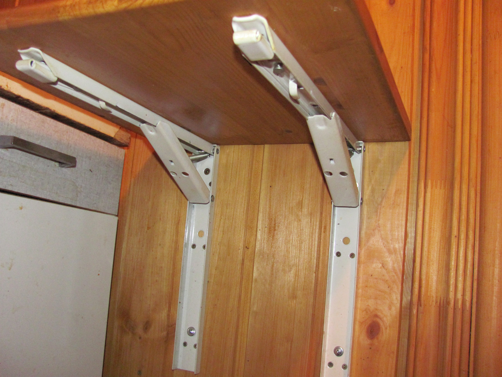Cette partie du mécanisme est fixée simultanément au mur et à la surface de travail de la table. Lorsque vous soulevez le couvercle, ce produit est réglé indépendamment à 90 ° et fixé dans cette position.Lorsque vous souhaitez plier une telle table, vous pouvez activer le mécanisme en le soulevant ou en tirant sur le levier spécial. Ainsi, les meubles se replieront doucement.
