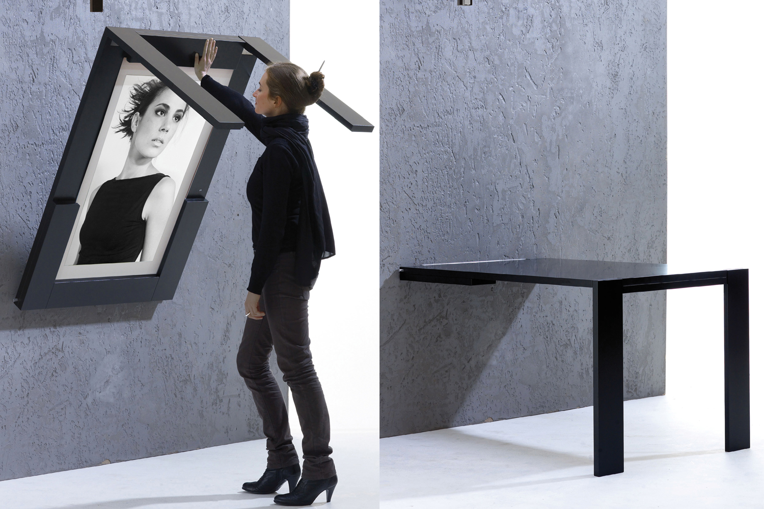 C'est un modèle très intéressant, qui a aussi une taille compacte. Il diffère des précédents en ce qu’il est mobile, le plus compact et le plus intéressant. Vous pouvez donc déplacer la table dans la pièce. Le dessus de la table ci-dessous comporte des guides le long desquels le dessus et la structure de la table entière peuvent littéralement chevaucher un mur.. Les guides sont presque invisibles et assurent la mobilité de ce produit.