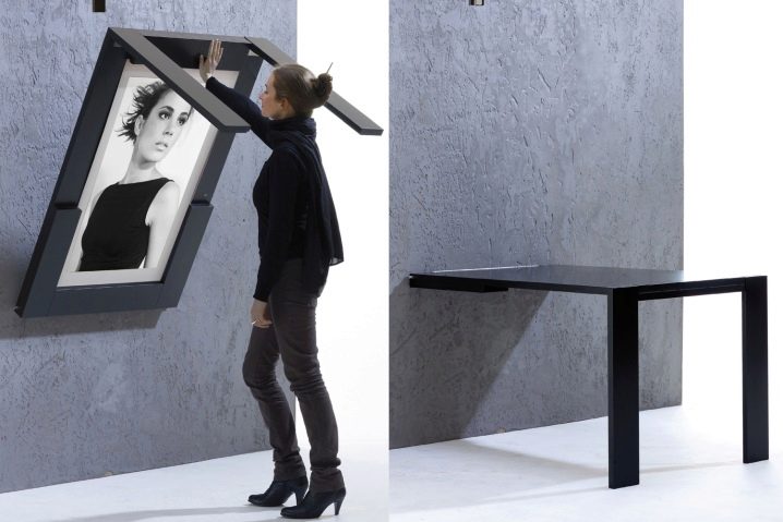 Ils peuvent être sélectionnés en fonction des paramètres de la pièce et de la disponibilité d’espace libre. Vous devez calculer combien vous pouvez plier une telle table, puis acquérir ce modèle.Extérieurement, ce produit peut ressembler à une étagère de grande largeur, aménagée lorsqu'il est nécessaire de placer des objets dessus.