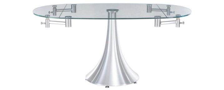 Aujourd'hui, les tables ovales coulissantes sont fabriquées dans une grande variété de matériaux. Les produits finis se différencient par leurs prix et leurs caractéristiques générales. Le principal avantage des tables de salle à manger en verre est qu'elles n'absorbent aucune odeur. Ce moment est essentiel pour la cuisine. Ils nécessitent un soin plus minutieux, car toutes les taches deviennent immédiatement visibles sur la surface du verre.