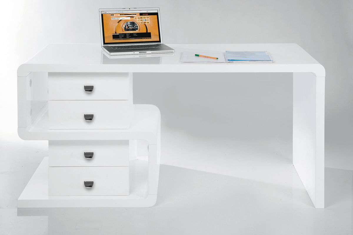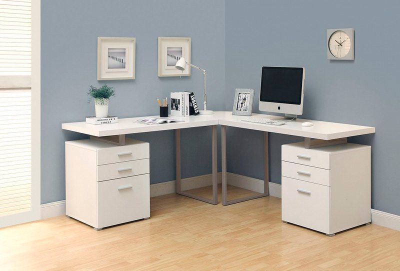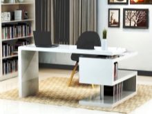 Le modèle blanc brillant d'un bureau avec une commode concentrera toute votre attention sur le travail, sans vous distraire d'une feuille de papier. Des boîtes pratiques vous permettent de placer tous les attributs nécessaires dans le processus. Les courbes intéressantes des pieds et des plateaux ajoutent de l'originalité au modèle.