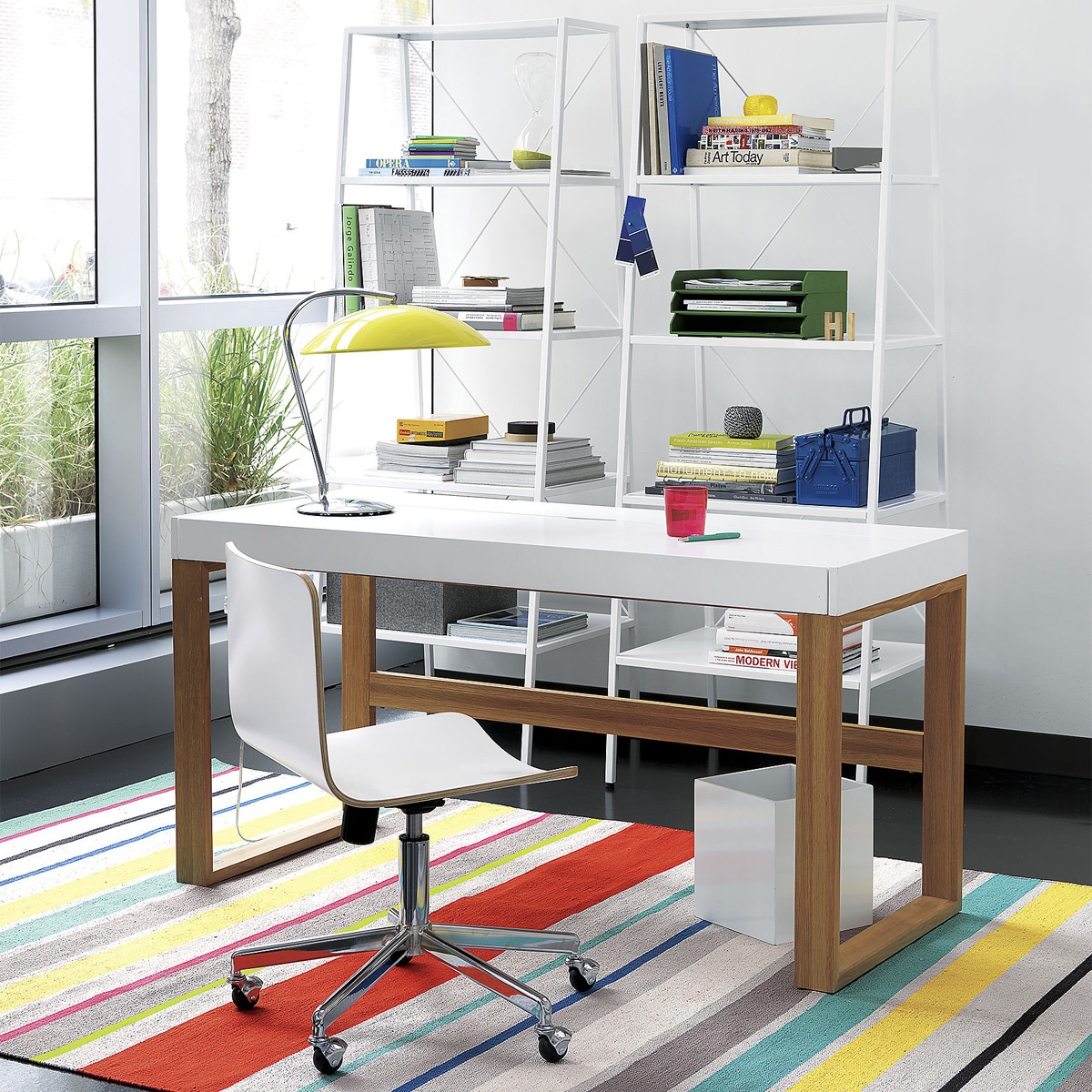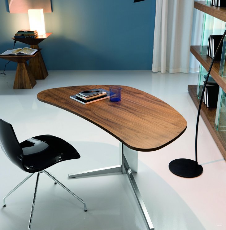 Un bureau avec des jambes en biais est une excellente option pour un bureau de style high-tech. La conception semble assez inhabituel. Une telle table, quelle que soit sa couleur, ajoutera de l'originalité à la pièce.