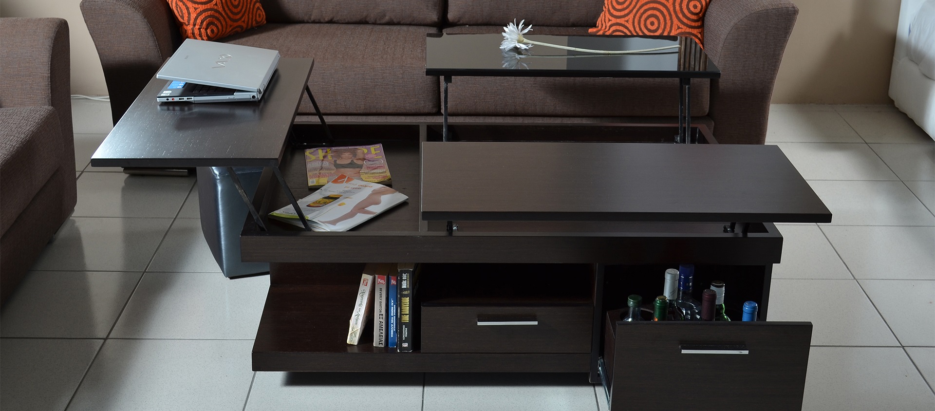 Pour les studios, une excellente option consisterait à transformer un modèle de table basse. Lorsque déplié en un seul mouvement, vous obtenez un lieu de travail à part entière.